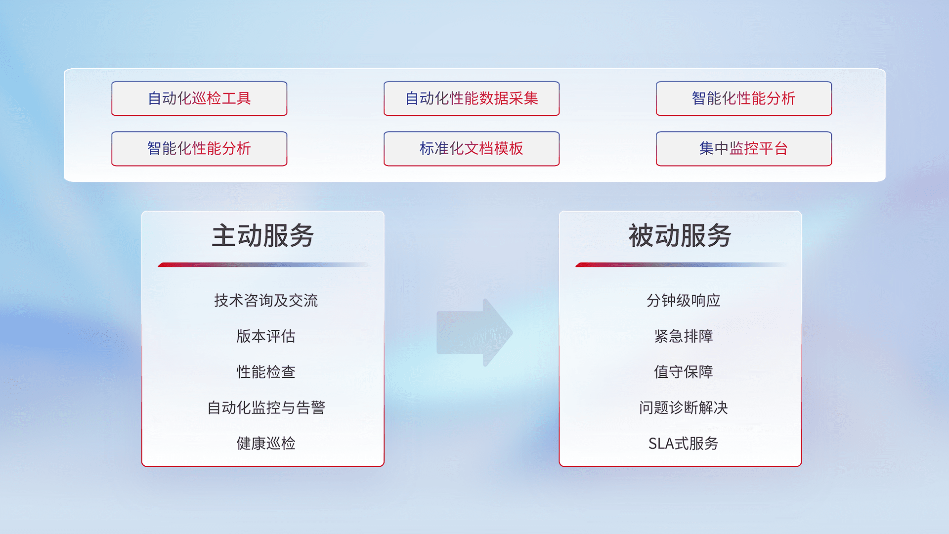 智能化工具和标准化文档,,保障服务质量,,,提供主动服务(包含技术咨询、、版本评估、、性能检查、、自动化监控与告警、、健康巡检)和被动服务包含(分钟级响应、、、、紧急排障、、、、值守保障、、问题诊断解决、、SLA服务)。。。